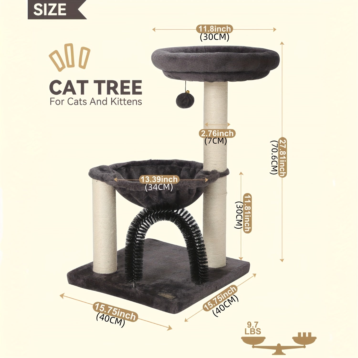 Overall size:The size of the cat tower is 27.8"Hx15.7" Wx15.7"L.Located at the top, the platform(11.8" diameter) ensure your cat a great view at high places. There is a basket(13.4" diameter) under the platform, which will give your cat a feeling of sleeping in the cradle